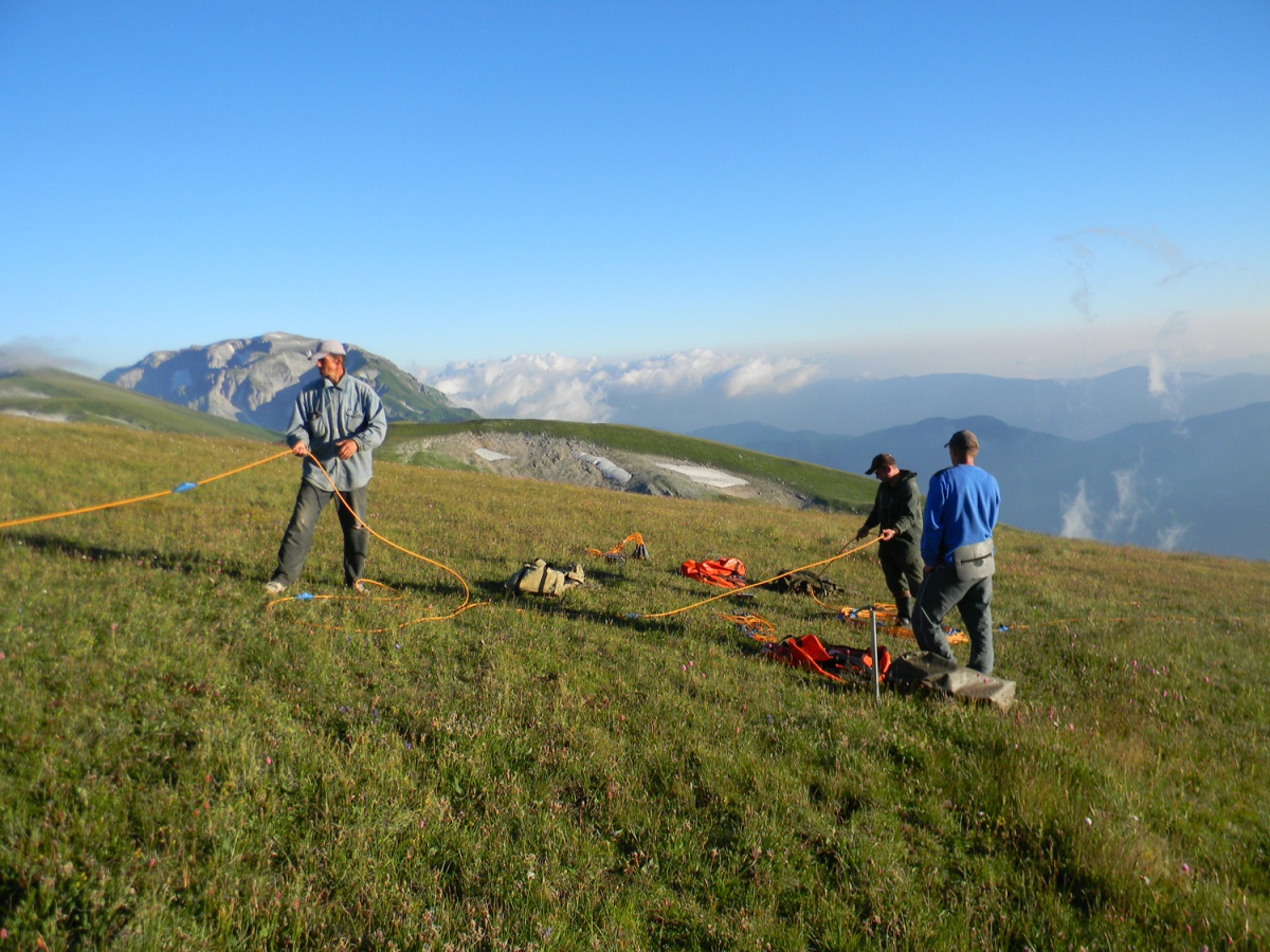 Результат обследования центральной части хребта меня вполне устроил. К имевшимся с прошлого года находкам добавились новые, ранее не встречавшиеся, двустворки и гастроподы. Так как удалось за один день провести «сканирование» склонов, было решено долго не засиживаться, и отправиться на следующий день дальше. Вечером мы всей компанией отправились на ближайшую высоту полюбоваться вечерними горами, сияющими в лучах заходящего солнца и сделать фотографии. На противоположном склоне заканчивали свою работу геофизики. Их палаточный лагерь стоял через увал от нашего. Ребята «прозванивали» пустоты - скоро здесь начнется строительство горнолыжного курорта. Так что, возможно, мы были последними, кому удалось побывать в еще нетронутых цивилизацией затерянных мирах хребта Нагой-Чук.