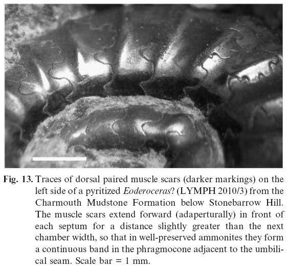 В процессе осмотра аммонитов выяснилось, что отпечатки мускулов сохраняются не только у замещенных пиритом образцов. Слабо заметная вентральная полоса есть и у аммонитов Eboraciceras sp. из Михайлова, хотя они и не пиритовые, а происходят из мергелевых конкреций.