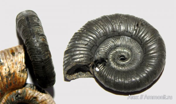 Еще одна маленькая (всего 2 см) раковина Binatisphinctes sp. У этого образца боковые отпечатки заметны лучше, чем у других бинатисфинктесов.