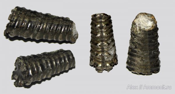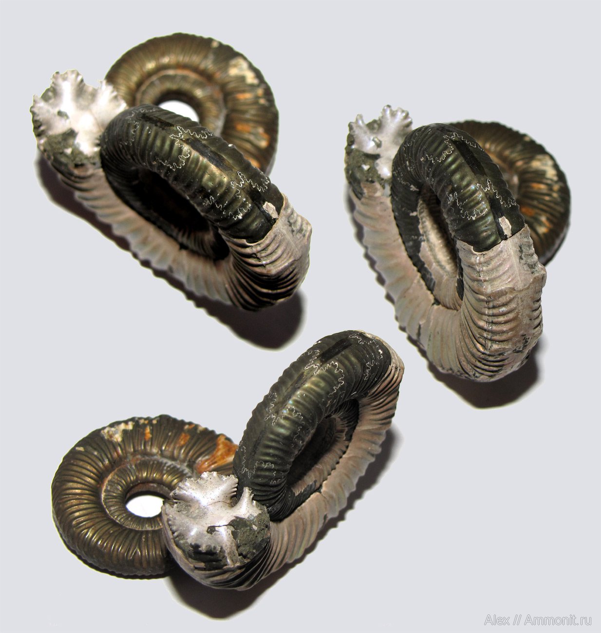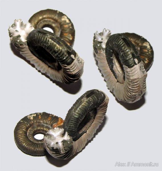 В этой публикации я хочу показать фотографии аммонитов, на которых видны подобные отпечатки мускулов. Собственно, у всех аммонитов общий план расположения этих мускулов одинаковый. Одна полоса идет по вентральной стороне раковины (вентральный мускул) и две по нижнему краю каждого оборота по бокам (дорсо-латеральные или дорсальные парные мускулы). Этот же план строения сохраняется даже у гетероморфных аммонитов. Но вот толщина и строение полос у всех разные.