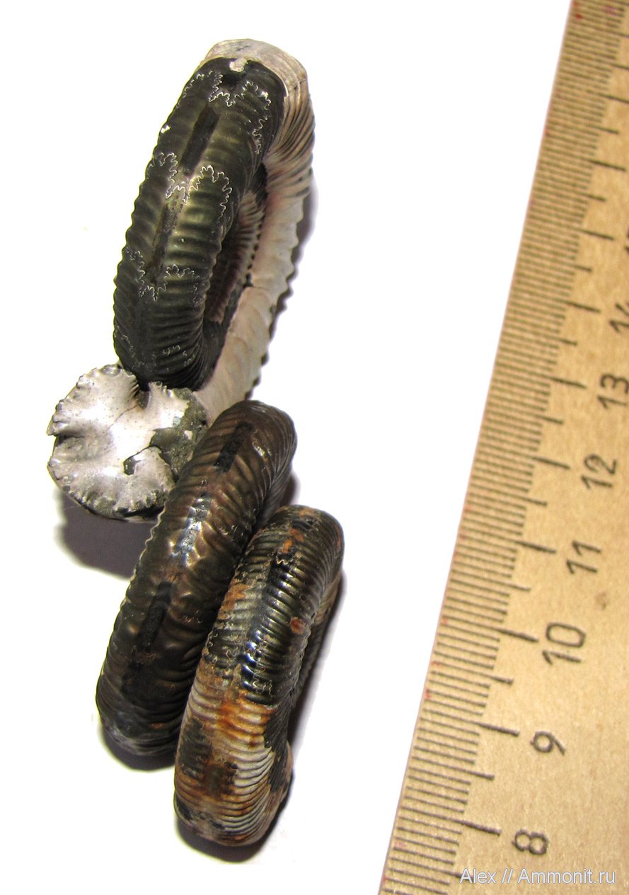 А на этом фото - нижнемеловой гетероморфный аммонит Toxoceratoides sp. Он уже есть на сайте на фото Фрагмент гетероморфного аммонита Toxoceratoides. Интересно, что у него тоже три полосы - из которых вентральная полоса самая тонкая. Черные полосы у них очень толстые.