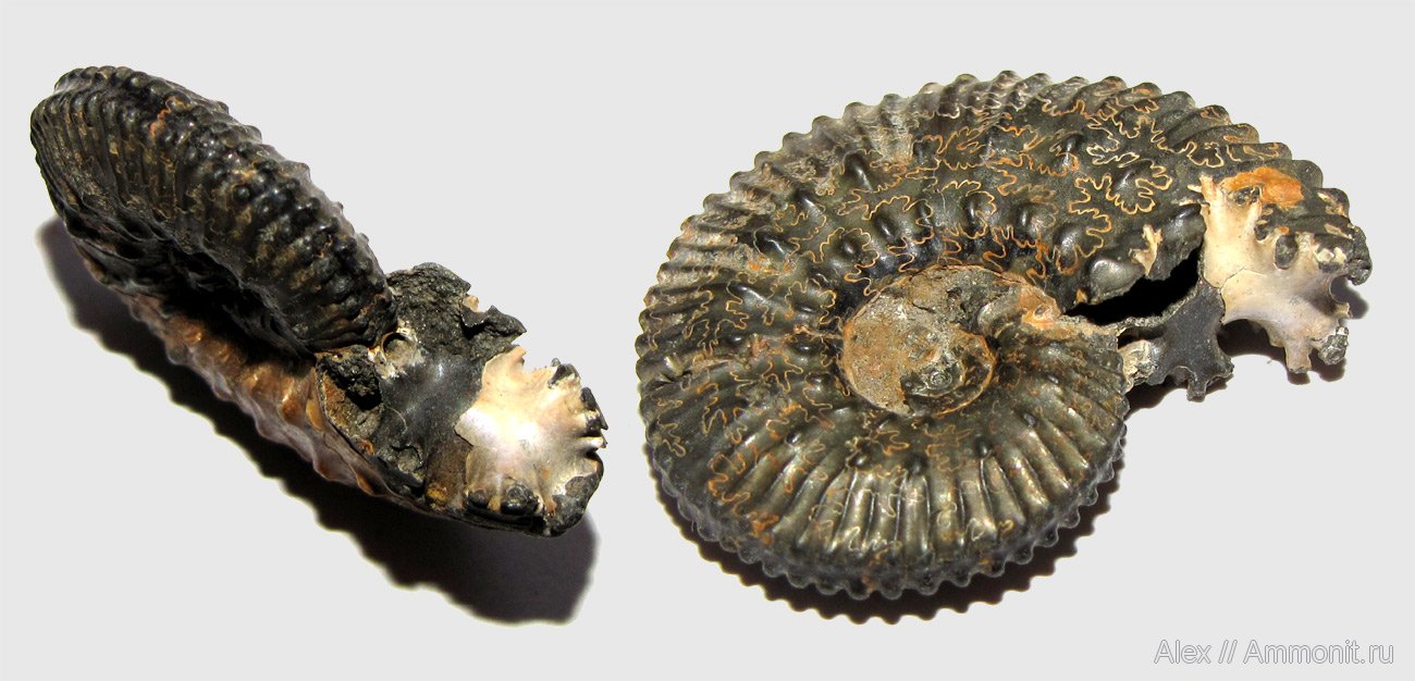 Когда аммонит умирал, раковина падала на дно и начинался процесс пиритизации, эти места также замещались пиритом, но иной кристаллической структуры, чем пирит, росший в полостях фрагмокона. Этот пирит и формировал необычные черные полосы на ядре, под слоем перламутра.