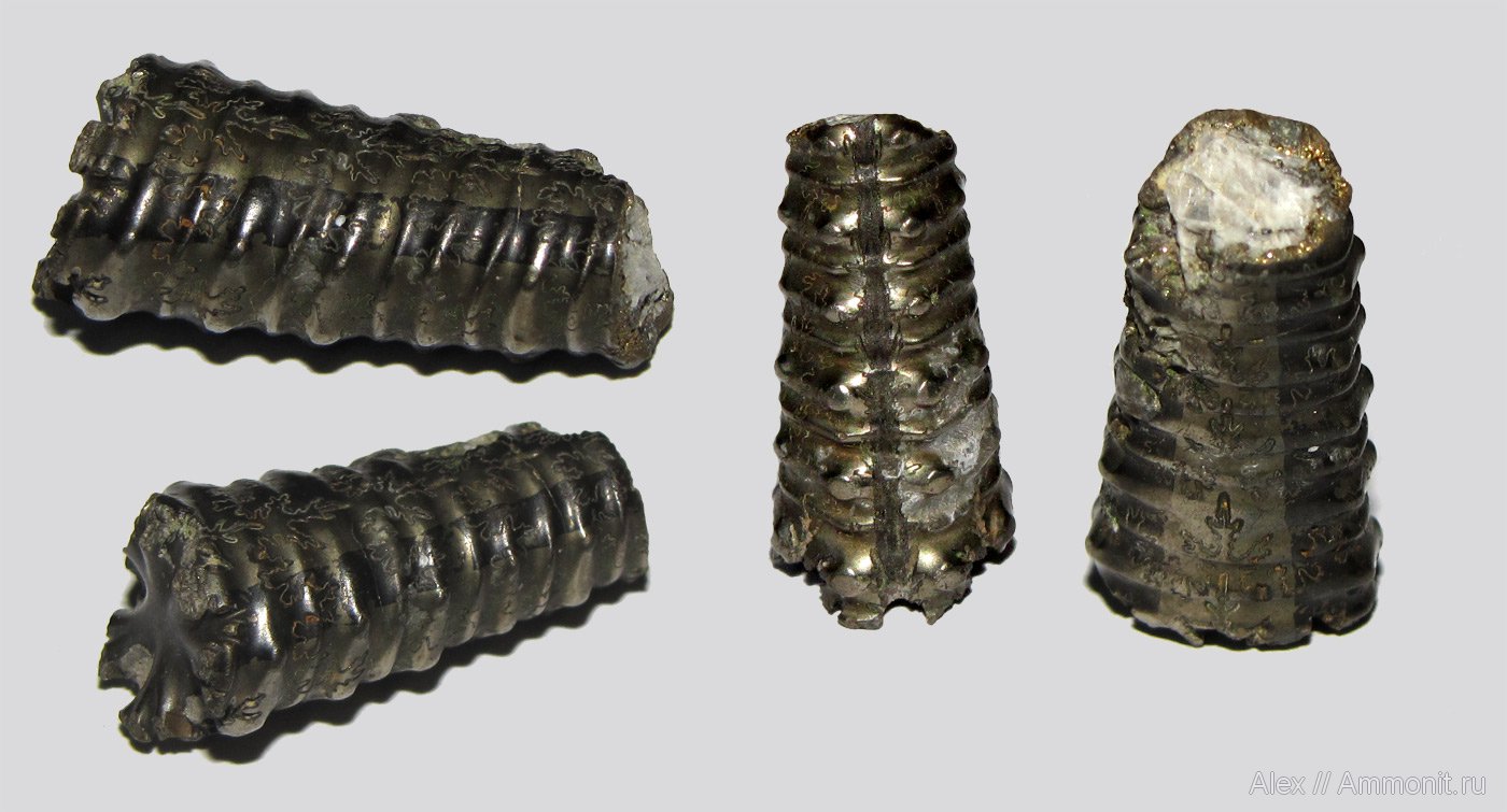 На многих пиритовых ядрах аммонитов из Михайлова можно встретить черные полоски на вентре и на пупковых стенках. Особенно хорошо видны эти полосы на вентральной стороне раковин рода Binatisphinctes. У некоторых образцов эти полоски выглядят так, будто к пиритовому ядру приклеили полосу магнитной ленты - они такие же черные и блестящие. Все эти следы видны только на пиритовых ядрах, в то время как на раковинах, сохранившихся на этих образцах, ничего нет, никаких следов подобной окраски.