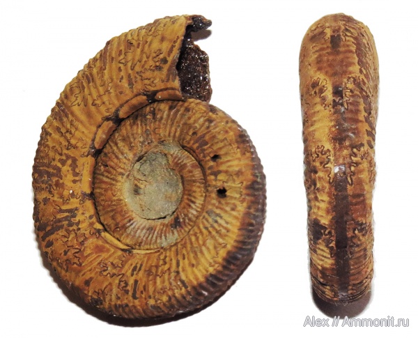 Еще один Funiferites, у него боковые отпечатки практически не сохранились, зато видна тонкая полоса на вентральной стороне. Второй аммонит служит подставкой ))