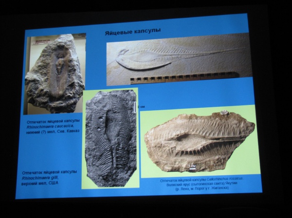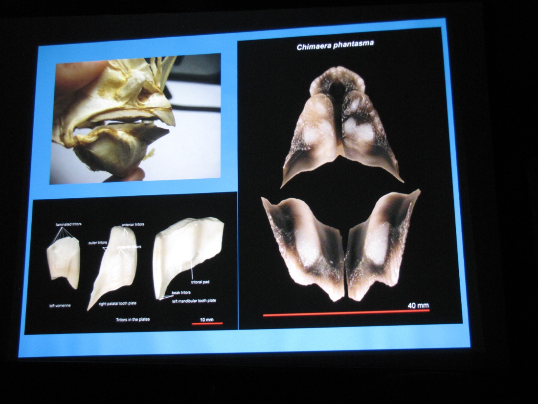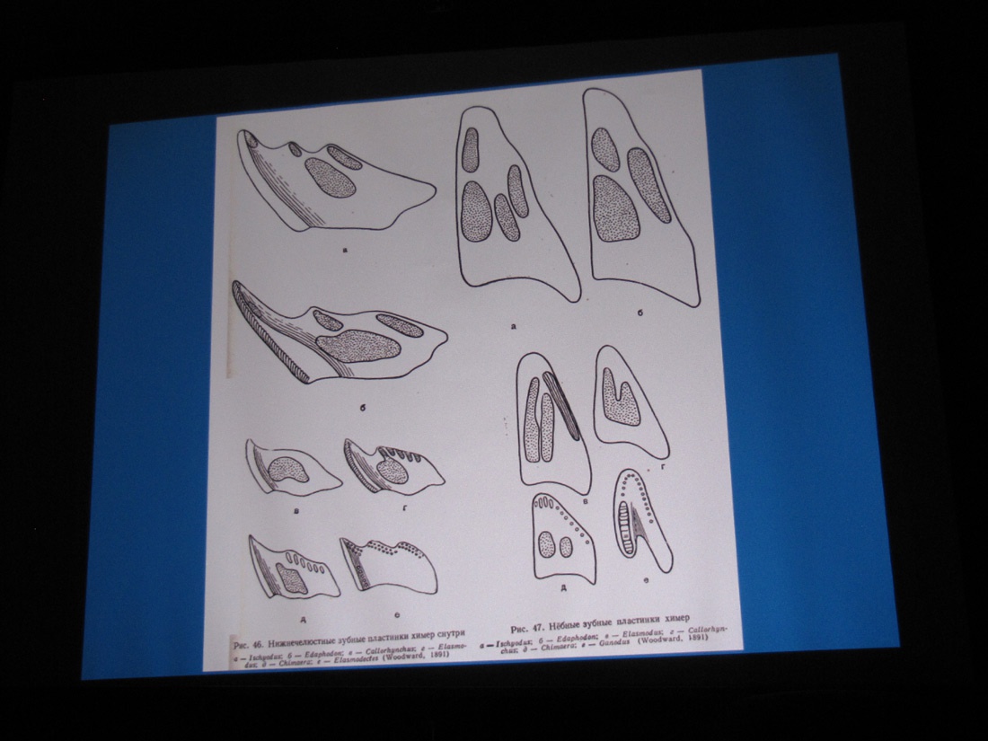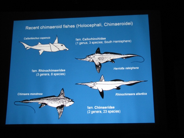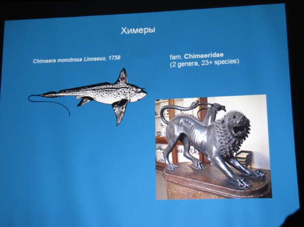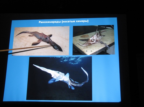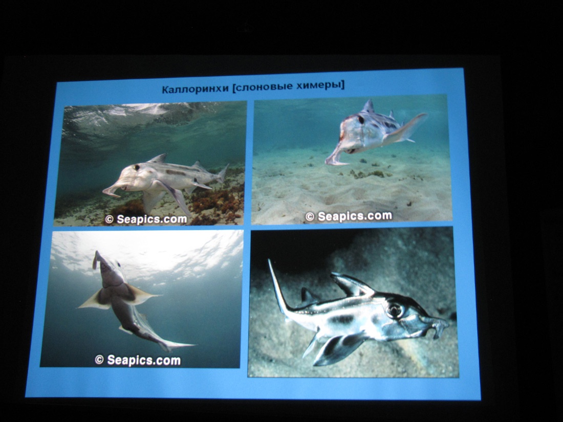Эта чрезвычайно интересная лекция была посвящена довольно экзотической и малоизвестной группе хрещевых рыб - химерам, которые родственных акулам. Это очень древняя и архаичная группа рыб, многие современные представители которых обитают на больших глубинах.