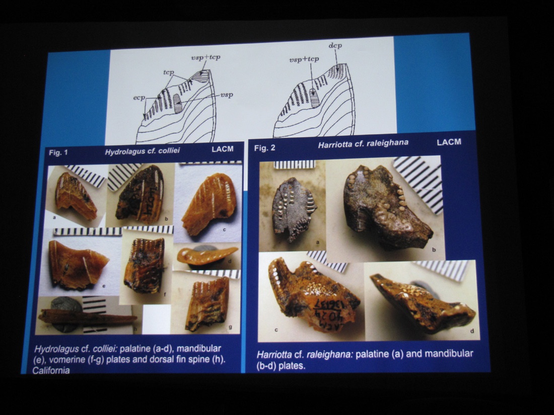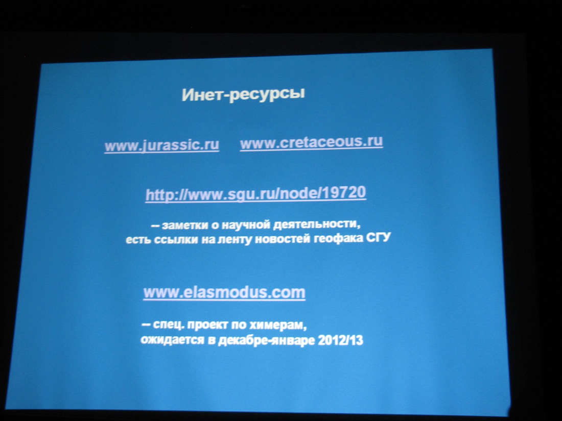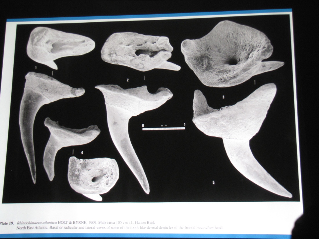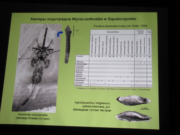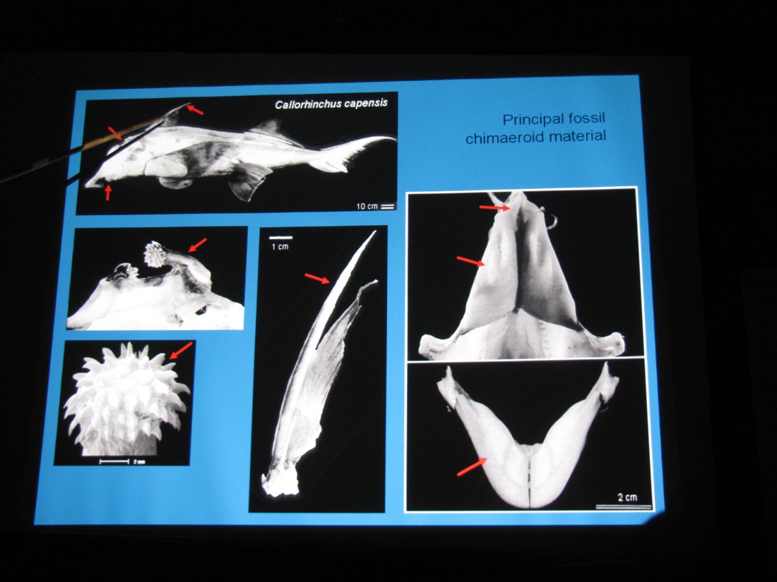 Эта чрезвычайно интересная лекция была посвящена довольно экзотической и малоизвестной группе хрещевых рыб - химерам, которые родственных акулам. Это очень древняя и архаичная группа рыб, многие современные представители которых обитают на больших глубинах.