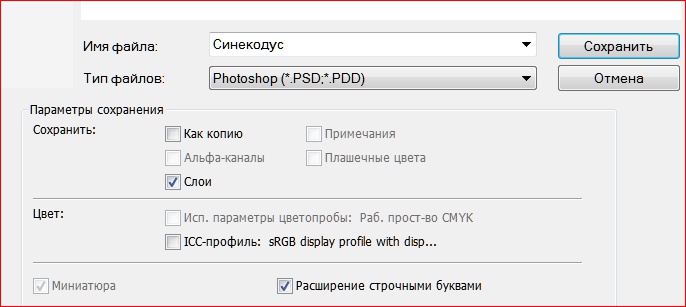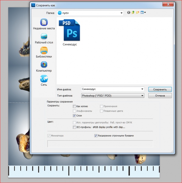 8. “Сохраняем файл как…” в формате программы Photoshop *.psd и даем имя, например, «Синекодус».