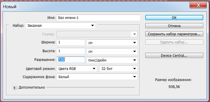 Объекты хороши, а вот фона не хватает. Поэтому создаем новый файл. Параметры могут любые, для Вас удобные. Мне нравится файлик размерами 1х1 см, с разрешением 720, RGB-16 бит: