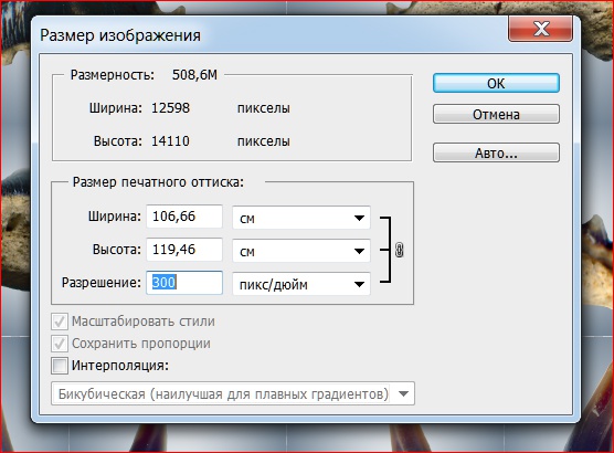 И только после этого заходите: {Изображение – размер изображения}. В появившемся окне снимаете птичку у «Интерполяции». Затем уменьшаете разрешение до 300. Одновременно с этим у вас увеличивается линейный размер изображения. Нажимаете ОК: