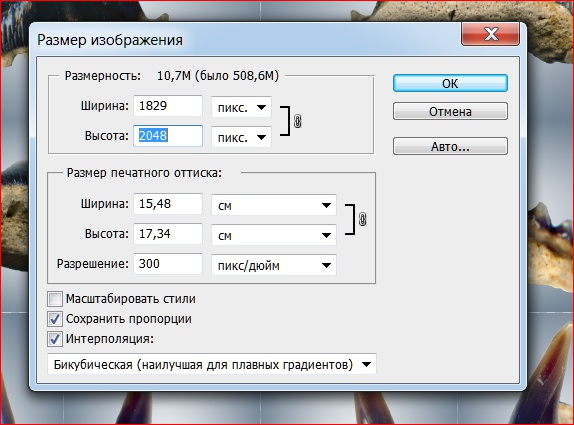 Еще раз заходите: {Изображение – размер изображения}. В появившемся окне возвращаете птичку «Интерполяции», а затем в в окошке с наибольшим значением (ширины или высоты) проставляете обязательное (для сайта Ammonut.ru) разрешение 2048. ОК. В нашем случае максимальным размером обладает высота (14110 pxl), эту цифру мы и меняем на 2048: