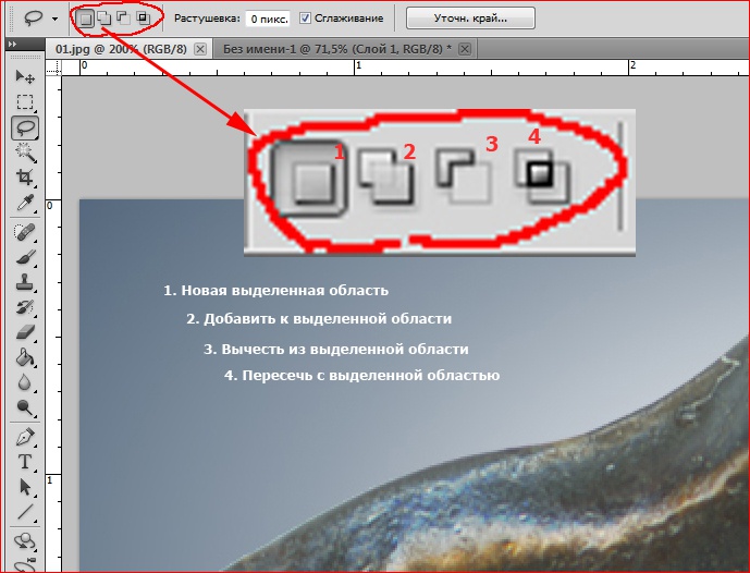 Когда выбираете инструмент {лассо}, то в верхнем левом углу появляется панель с доп. функциями: