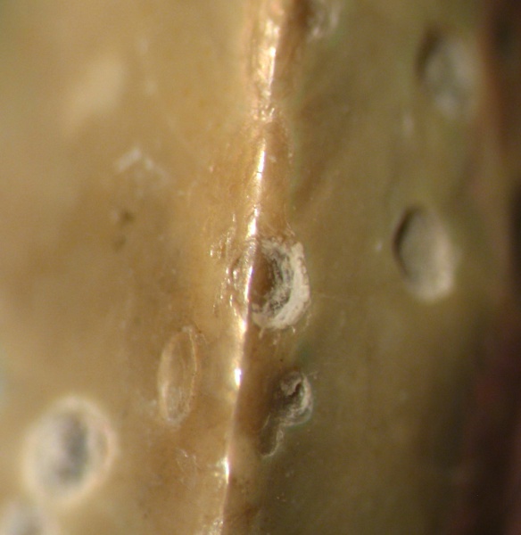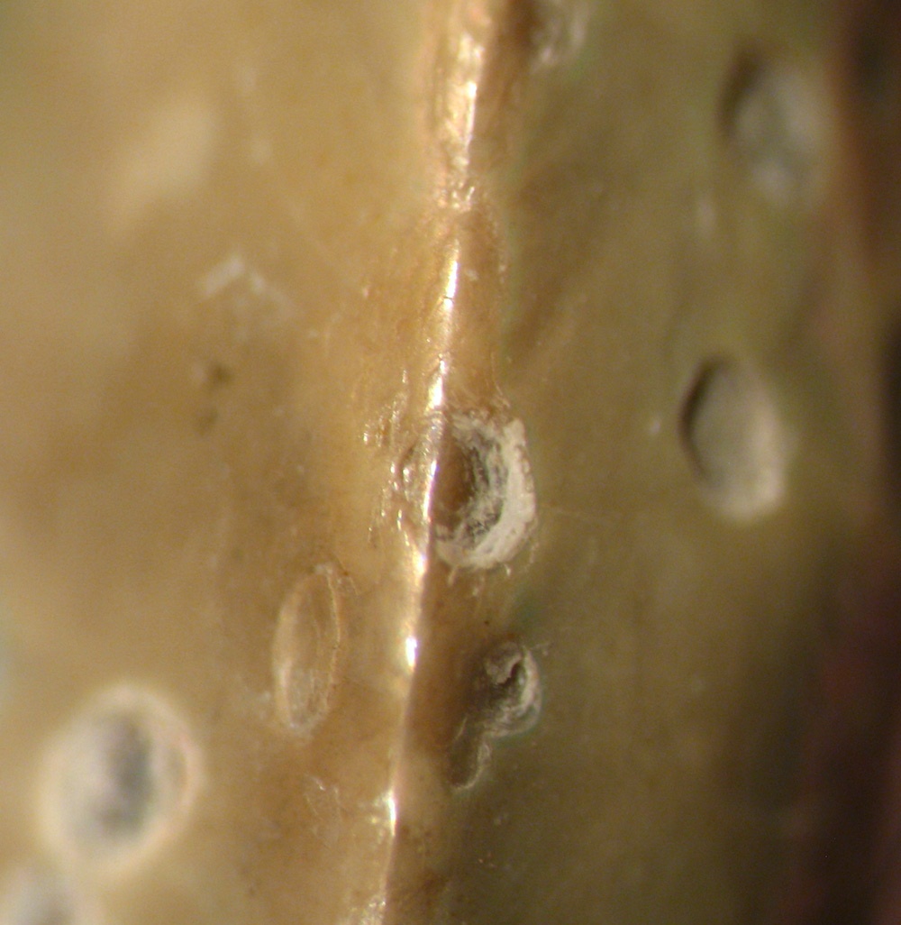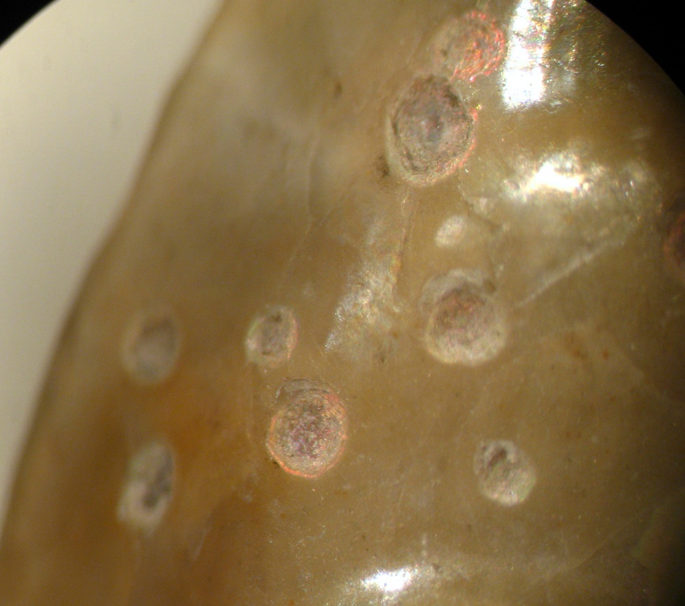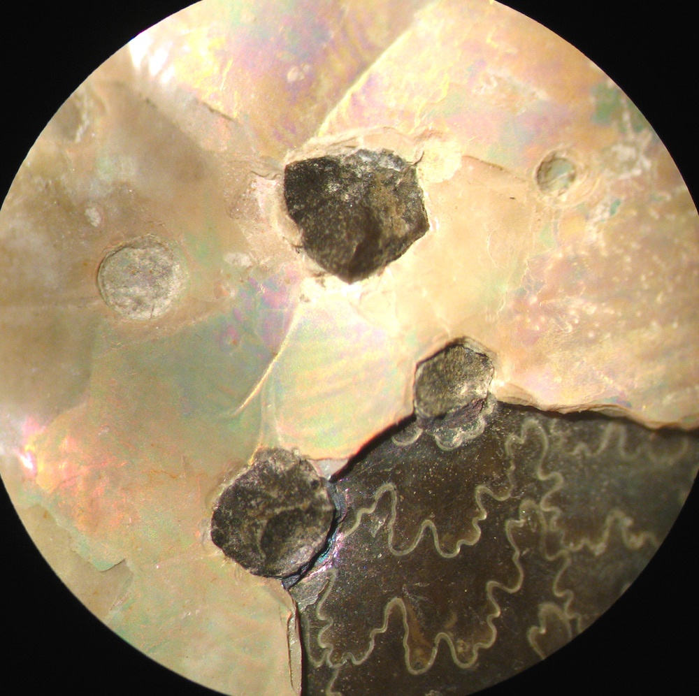 Перламутр на его раковине оказался покрытым небольшими вмятинками, кое-где раковина была пробита насквозь. Первоначально я списал это на плохую препарацию, но теперь засомневался и решил посмотреть образец в микроскоп.
