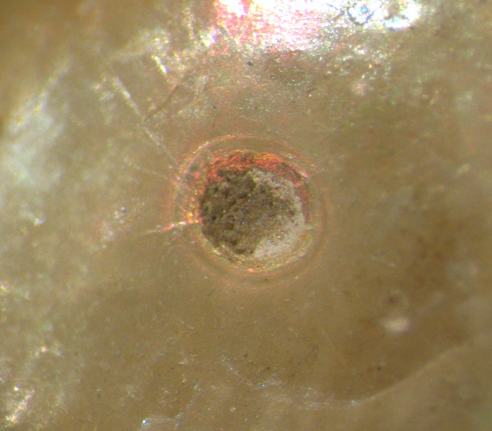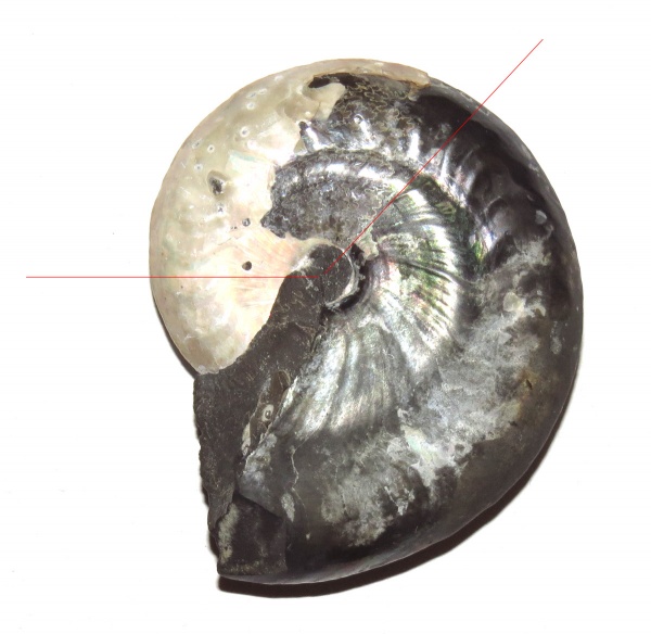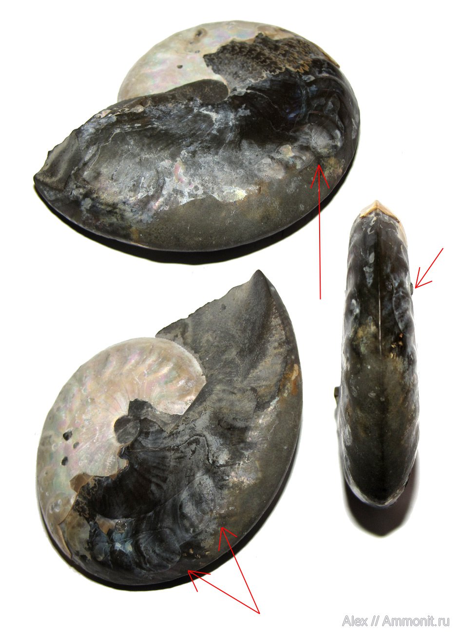 Интересно расположение дыр и вмятин на раковине. У моего образца они находятся преимущественно на фрагмоконе, но недалеко от края жилой камеры. На самой жилой камере я нашел только две вмятины и одну дырку - все недалеко от границы с фрагмоконом. Хотя на жилой камере нет перламутра, можно быть почти уверенным, что других вмятин там не было, так как их следы видны на ядре.