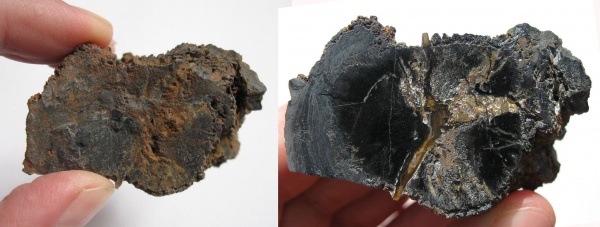 Трещины на образце слева залиты обильно светлой смолой (для фиксации), не поддающейся удалению.