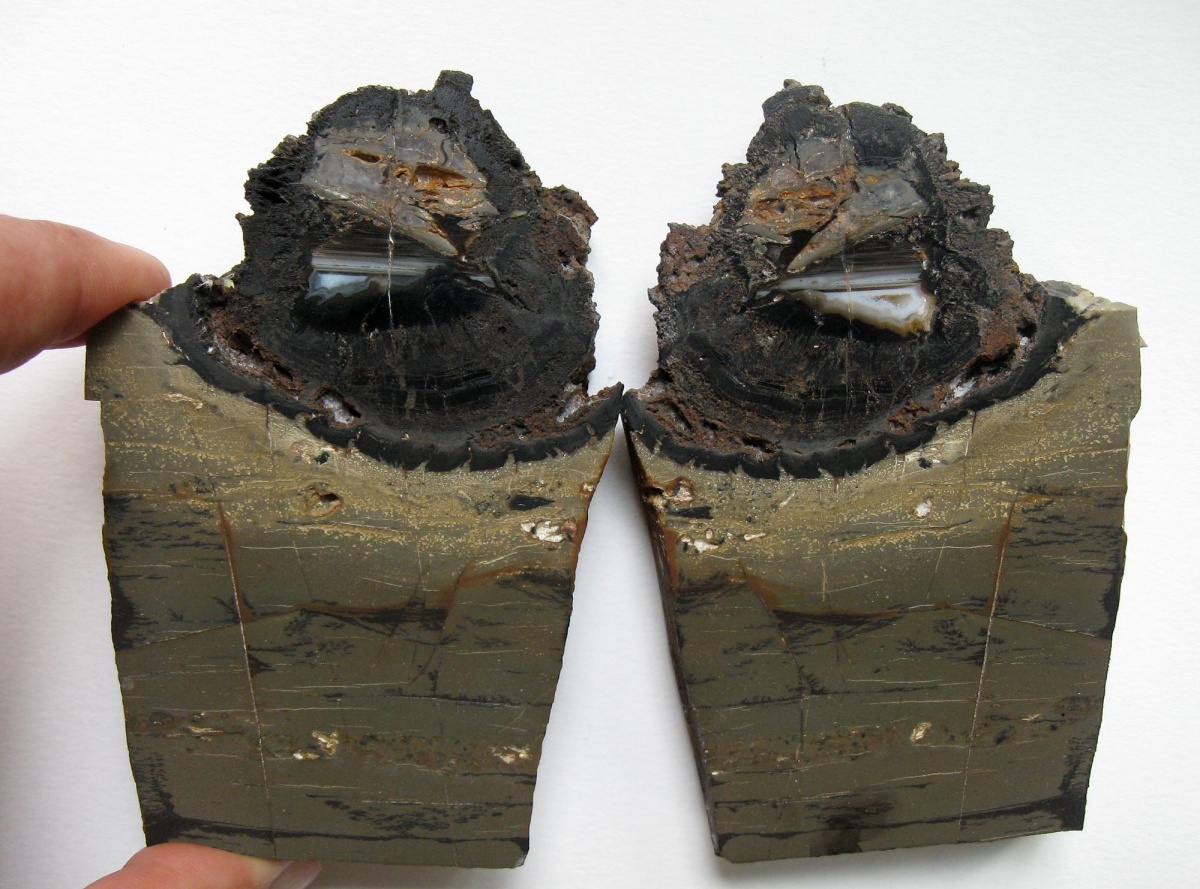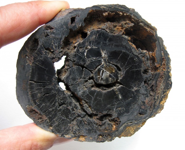 Помимо того, что здесь частично сохранилась кора, в сердцевине можно увидеть интересные агатики с ониксовой слоистостью. Порода, в которой находится образец - кремнистая, с дендритами (практически яшма).