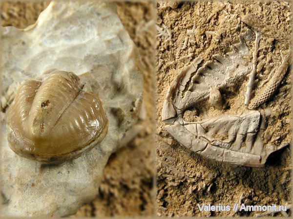 Гжельские верхнекарбоновые трилобиты размерами 10 и 18мм соответственно. Слева свеже отпрепарированный привычный вид, справа удачный вид обратной стороны панциря природной обработки.