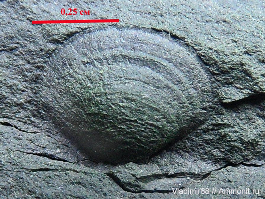 Отпечаток (ядро) двустворки размер 0.5 см найдена в районе строительства одного из объектов «саммита» в г.Владивостоке. Обнаружена в результате разбора шаровидной конкреции весом около 3 кг состоящей из мягкого слоистого серого минерала (возможно глины) поверхность конкреции была более твёрдая, ржаво-рыжего цвета. Кроме этой двустворки в этой конкреции обнаружено ещё несколько (три) окаменелостей, скорее пустот, с отпечатками раковин предположительно гастропод размером 0,5-0,7 см. но при расчистке они разрушились, увы.