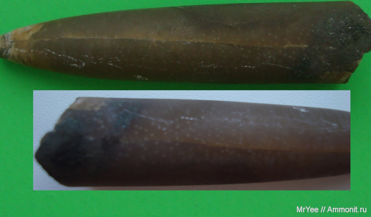 Пятнышки идут по всему ростру, но бледнеют не доходя до острия, а со стороны отверстия их скрывает нарост пирита(эта чёрная штука - пирит). На верхнем фото видно(сверху) пятно эрозии в нём точек нет. | ||||||