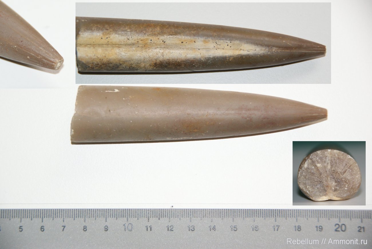 Сейчас снимок гораздо лучше. На снимке Ростры Holcobeloides beaumontianus (d'Orbigny, 1842) брюшные борозды можно рассмотреть - они похожи на эту. Но этих ростров есть еще одна особенность- полость в которой находиться фрагмакон. располагается близко к острию и для ростра этого размера она должна начинаться на расстоянии 5-7 см от острия. Здесь. судя по линейке 11см сплошного ростра, так что может это и не Holcobeloides beaumontianus.
