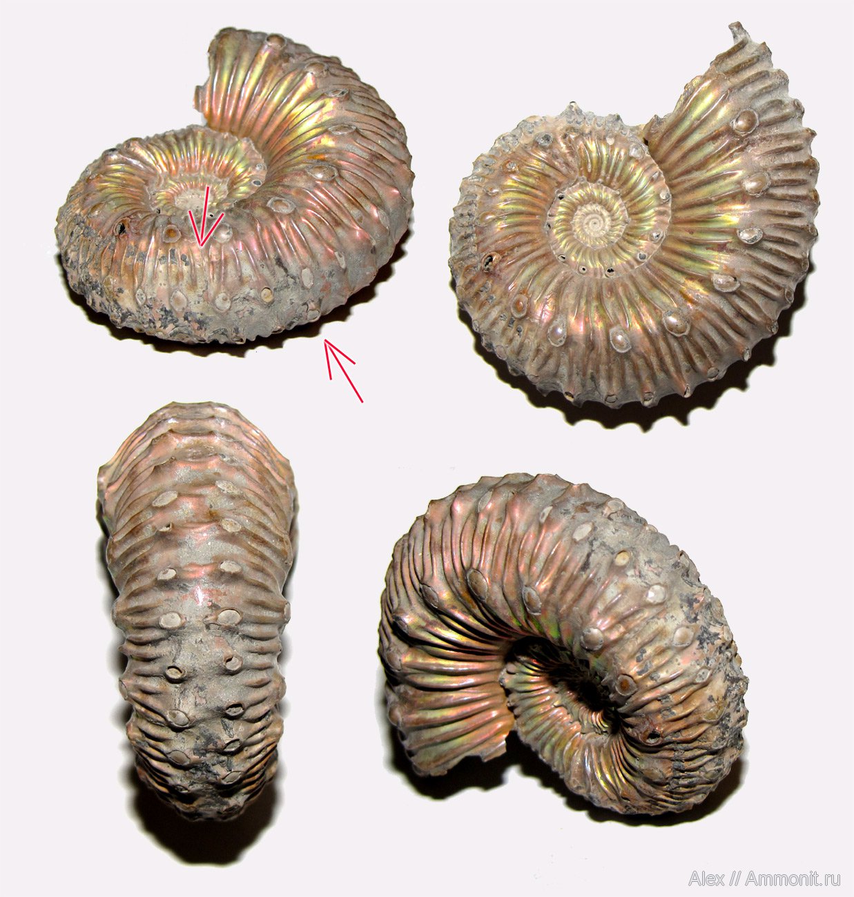 Небольшой (диаметр 4 см) аммонит Kosmoceras spinosum. Аммонит очень красивый и у него видны остатки темного слоя, которым выстилалась стенка более раннего оборота внутри жилой камеры. Стрелкой отмечена площадка для крепления затылочной части мантии - она располагалась за пределами жилой камеры. Скорее всего, этот аммонит не достиг максимальных размеров и эта площадка временная, позже она бы скрылась внутри жилой камеры. Но вообще у космоцерасов даже во взрослом состоянии эти площадки очень маленькие и по ширине не выдающиеся за пределы стенок жилой камеры. К сожалению, все эти детали видны у данного образца не очень хорошо, но он интересен сам по себе, благодаря хорошей сохранности.