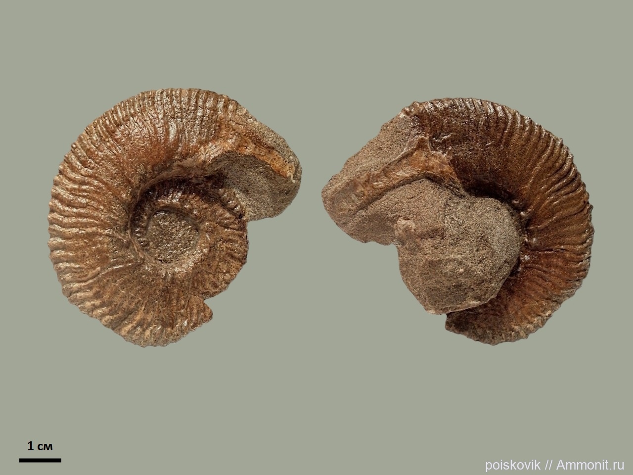 Аммонит с ушками (в 2-х проекциях). Берриас. Диаметр - 6,5см. Длина ушка - 2,5см. На одном из ушек четко видны следы наростания.