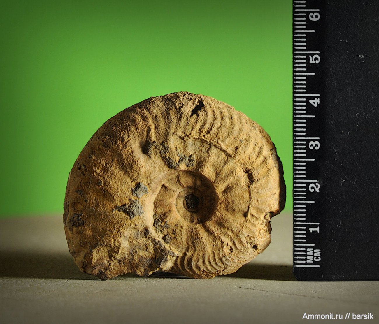 У этого аммонита интересная ребристость. Первые - гладкие обороты, потом идут редкие одиночные ребра, затем они становятся частыми и ветвятся и ближе к устью снова становятся редкими.