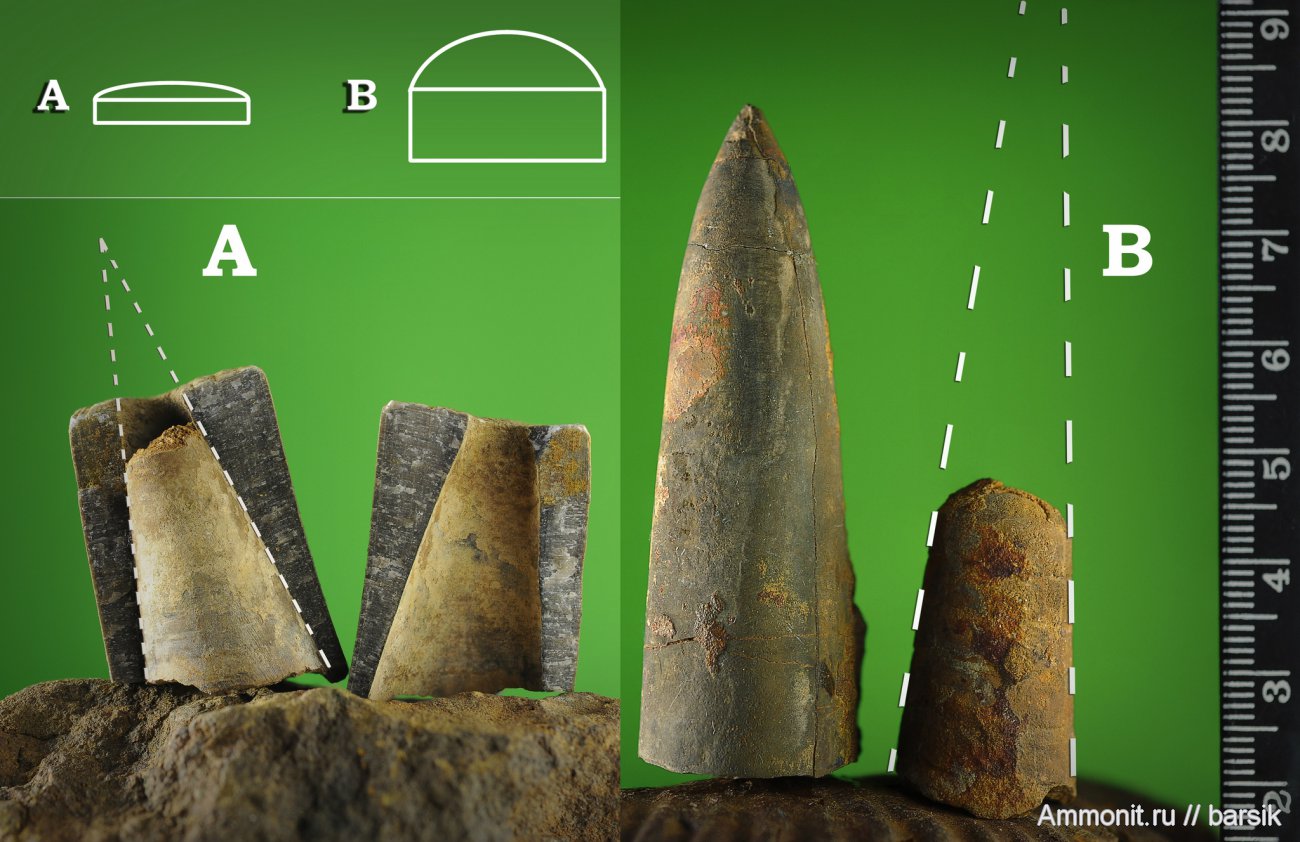 Отложения находятся в верхнем течении р. Большой Зеленчук в русле одного из притоков и представлены крепкими песчаниками и глинистыми сланцами. Белемниты, судя по фрагмаконам, представлены пока двумя видами. Если ростры примерно похожи и имеют гладкую структуру без борозд, то фрагмаконы очень сильно различаются апикальными углами и размерами камер по высоте (А В).