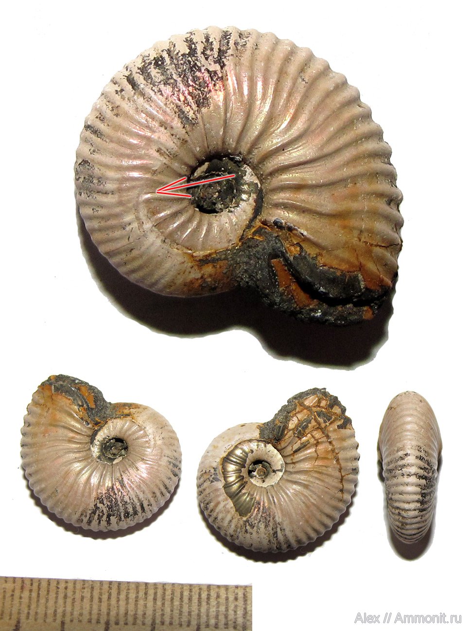 На моей фотографии внизу показан аммонит в трех ракурсах, а сверху он же, но крупнее, чтобы было лучше видно. Видно, что слой и площадка с обеих сторон раковины абсолютно симметричны. Стрелочкой показано местоположение устья. Все что выше стрелочки - непосредственно та площадка, к которой крепился "затылок" аммонита.