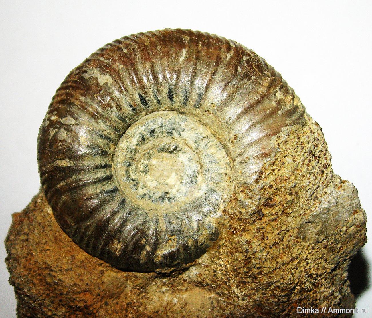 Аммонит найден в верхней части нижнекелловейского мергеля у д. Никитино в 2010 г. Диаметр раковины около 43 мм.