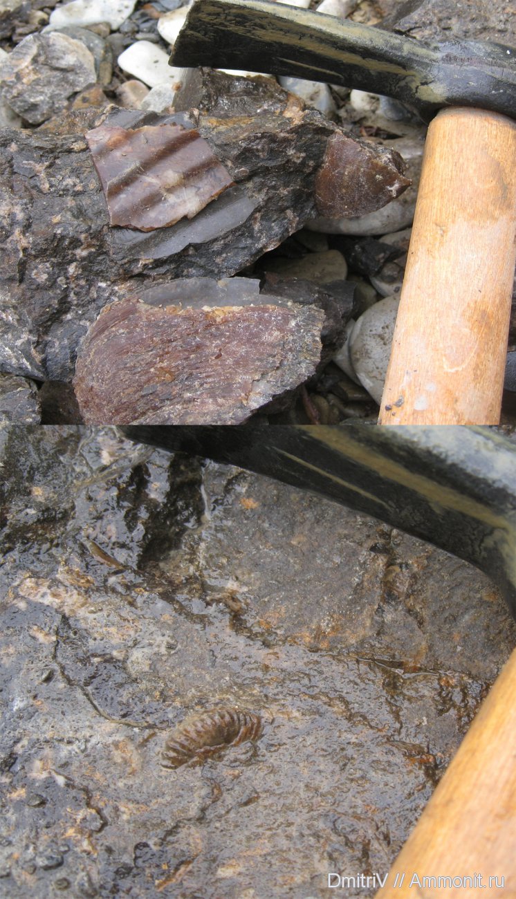Внизу: маленький аммонит до удаления породы. Он оказался внутри аммонита большего размера.