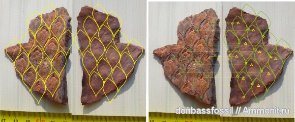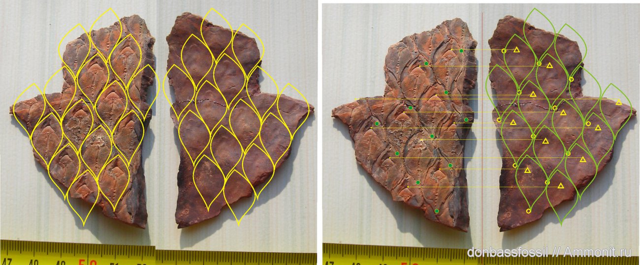 Двусторонний отпечаток коры лепидодендрона (Lepidodendron obovatum). На лицевой поверхности (левое фото в парах) видны классические листовые подушки с хорошо различимыми листовыми рубцами, это отпечаток истинной формы коры, так как если бы ствол вдавили в мягкую глину или пластилин («негатив» формы). Задняя сторона образца показывает как бы «позитив» того же участка коры, хорошо различимы следы формы листового рубца (треугольники на схеме) и отверстия следов васкулярной (водоснабжающей) системы (прозрачные кружки на схеме), проекции этих следов показаны и на лицевой поверхности образца (зеленые кружки). Они странным образом не совпадают с листовыми рубцами, то есть оригинальный кусок коры был деформирован перед захоронением. Казалось бы, ничего оригинального. Ну, упал кусок коры в мягкий ил, со временем исчезла органика, сохранив форму верхней и нижней поверхностей, затем пустота заполнилась породой. Толщина образца 1,5 мм, прижизненная толщина была в несколько раз больше, возможно, порядка 10 мм. Получается, что форма листового рубца и листовой подушки проявлялись достаточно глубоко в коре. Более того, отпечаток задней поверхности не плоский, он состоит из выпуклостей и вогнутостей, соответствующих орнаменту и форме листовых подушек лицевой поверхности.