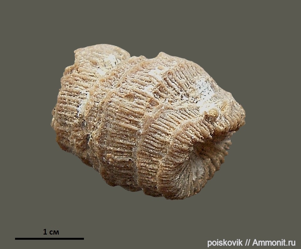 Фрагмент одиночного коралла из урочища Менистер. Найден в окружении стеблей морских лилий и игл морских ежей. Размер - 2см.