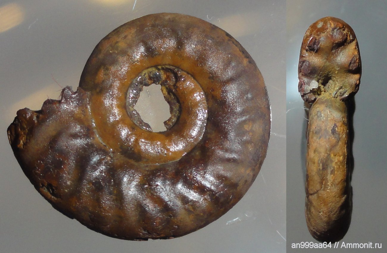 Какой интересный аммонит! Что-то в его ребристости есть от Hecticoceratinae, какое-то сходство с Brightia. Вроде и сечение округлое на вентральной стороне, и киля не видно, а ребрами похож на гектикоцератин. | ||||||