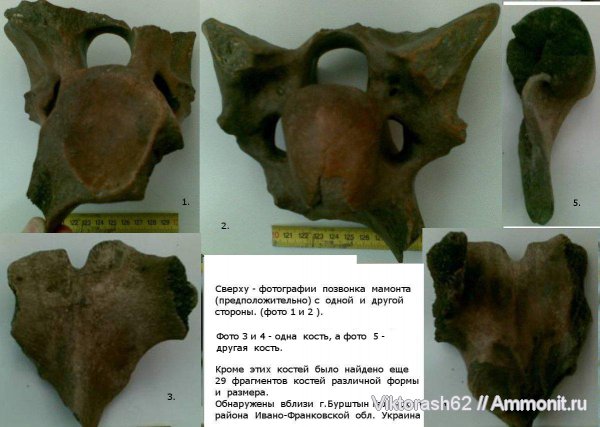 представляю три косточки из 34, найденных мною в отвалах вблизи г.Бурштын. Я сравнил позвонок с имеющимися фото, однако есть большие расхождения, а также природовед из обласного музея предположил, что это могут быть косточки не мамонта, а мастодонта. Не знаю, но сам думаю, что это может быть и хоботное, но до мамонта. Подскажите.