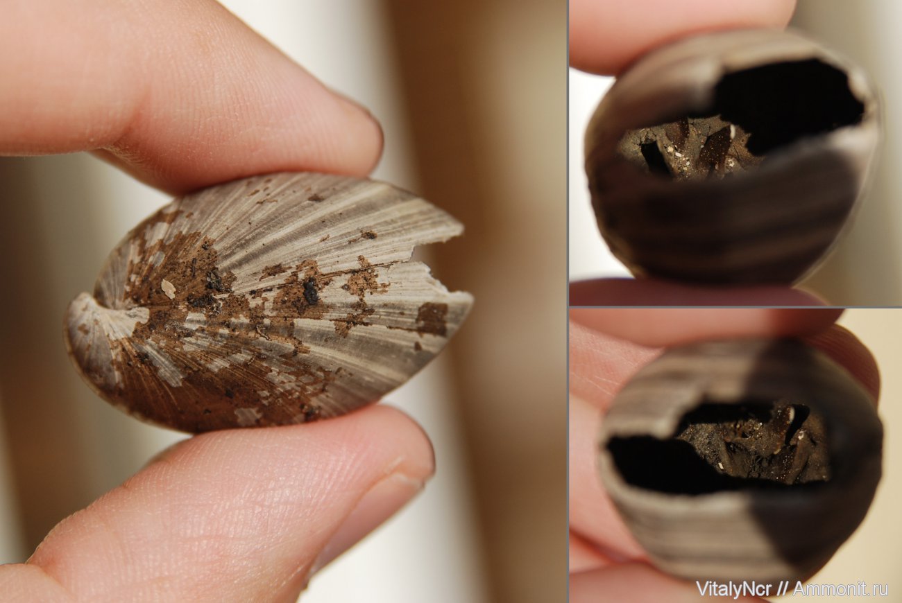 Может быть мы говорим о разных вещах? Два крупных выступа внутри раковины - это конечно замок, часть раковины. Эти брахиоподы при раскопках рассыпаются десятками, как они выглядят внутри хорошо известно. Вокруг выступов видно какое-то напыление, которое вполне может быть мельчайшими кристалликами. | ||||||