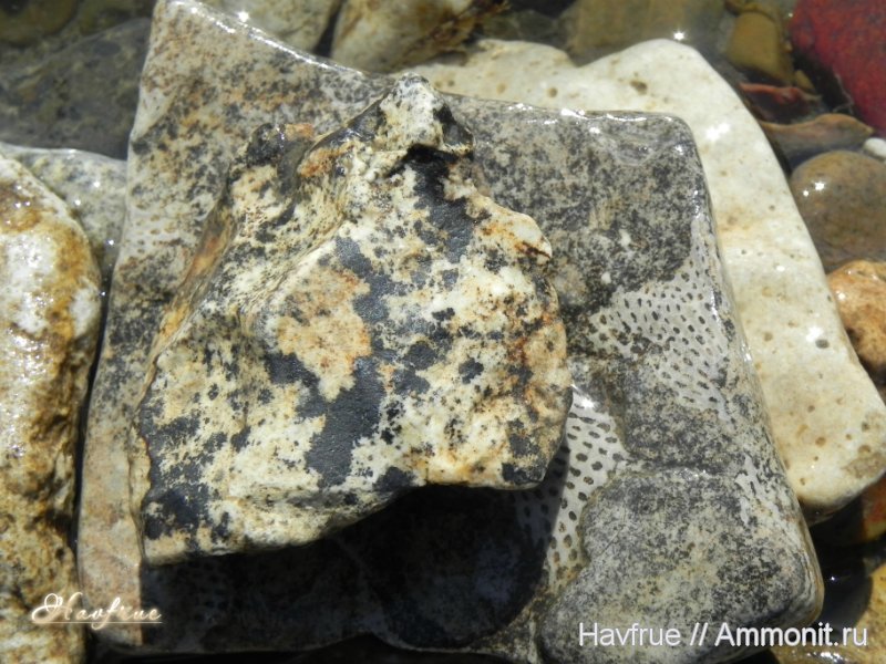 сверху кусочек вмещающей породы с признаками омарганцевания