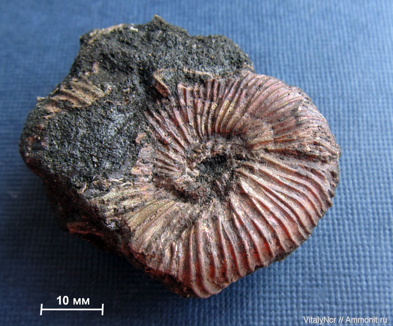 Мне сначала показалось, что у него некоторые рёбра ветвятся последовательно, как у виргатитов, но, возможно, в этих местах его так расплющило, что соседние рёбра подошли близко друг к другу. | ||||||