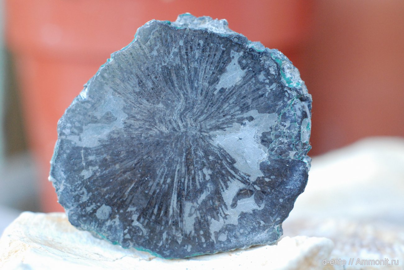 Поперечное сечение четырехлучевого коралла. Сохранность образца ниже средней, но на шлифе можно рассмотреть внутренние строение.