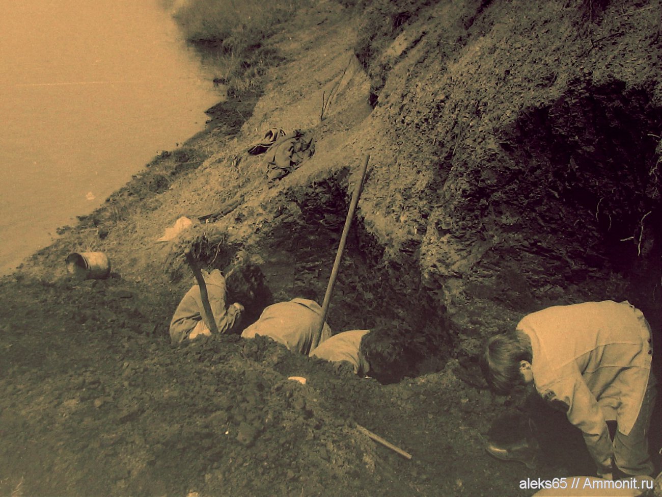 На расстоянии 5-7метров от этого слоя в право, на уровне воды и под ней, был сплошной пласт пирита, толщиной 10-25мм, разбитый на отдельные плитки 5-20см в поперечнике. На плитках были потрясающей красоты барельефы аммонитов и трехрогих гастропод (с рогами) идеальной сохранности. Барельефы возвышались над поверхностью плиток на треть и четверть объема раковин, редко на половину. Барельефы аммонитов были с прекрасным зелено-сине-фиолетовым перламутром, а раковины гастропод с четко читаемым объемным рисунком поверхности. И все это на изысканом фоне мелких золотистых кристалликов пирита до полутора миллиметров размером. Иногда кристаллики высыпали на вершинах ребер аммонитов, и уже они великолепно смотрелись на фоне перламутра.