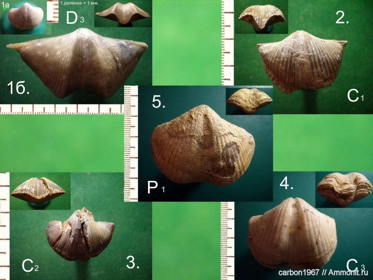 Нет рода Spiripher, а есть Spirifer. C данного ракурса вижу только 1 такую раковину, а остальные Cyrtospirifer, (?)Licharewia и (?) Brachythyrina. Под ? т.к. не видно у них ареи :( А №1б у меня есть подозрение, что это из МО что-то наподобие Brachythyrina, а для увеличения цены указали, что Воронежская область, но это мое предположение, точно можно будет утверждать, когда найду книгу Наливкина Д.В. "Семилукские и Воронежские слои"...