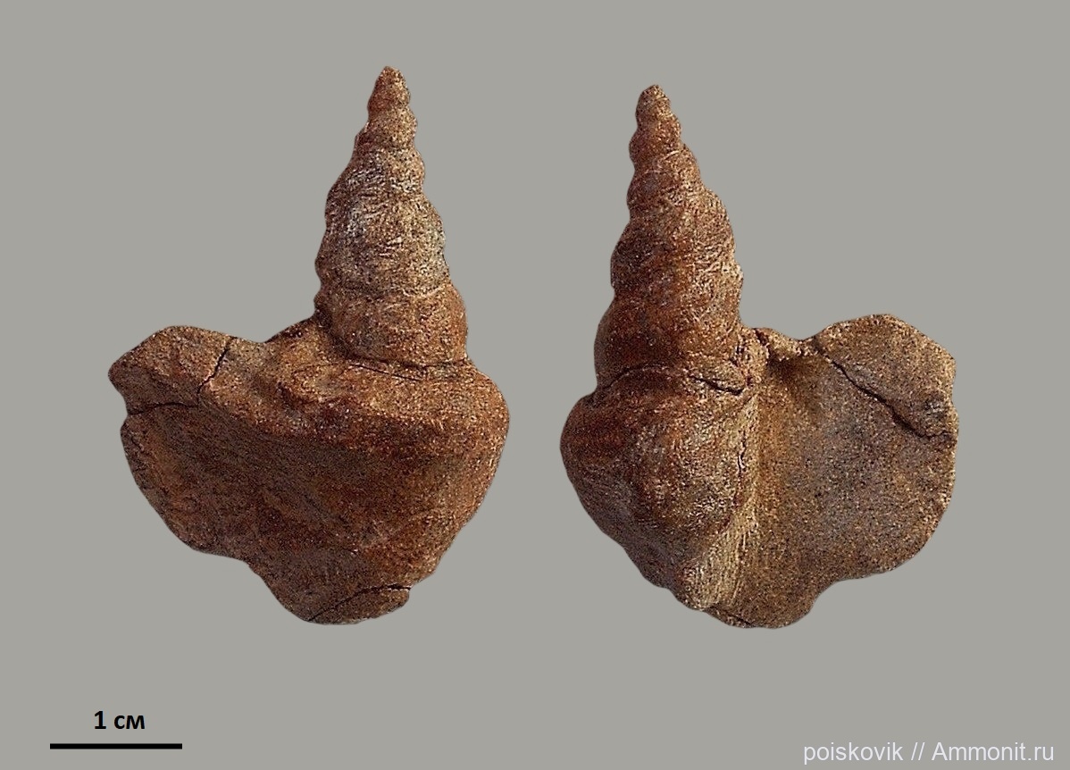 Необычная гастропода (в 2-х проекциях): последний виток спирали раковины моллюска развернут в виде "крыла". Размеры: 4,5см Х 3,5см. Берриас.