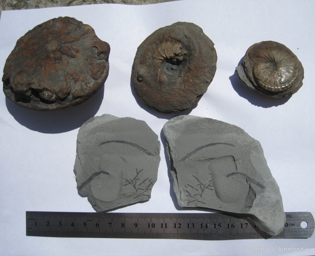 Одна ихнофоссилия, два аммонита в конкреции и водоросоль (?). Подробнее на следующих фото.