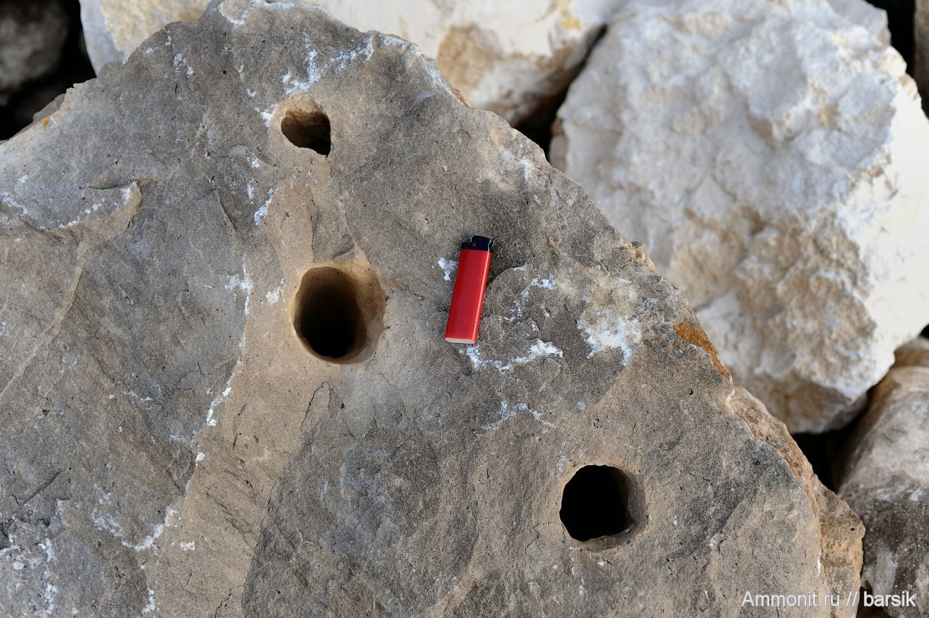 В этих очень крепких глыбах известняка встречаются чьи то длинные ходы с зализаными стенками диаметром до 7см. Неужели были такие черви?