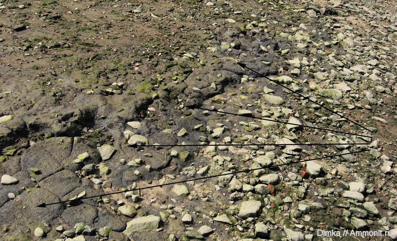 На фото правый берег р. Волги в р-не Переборы г. Рыбинска. Стрелками показан выход темных очень вязких глин среднего-нижнего келловея. Слои в этом месте выходят на поверхность не горизонтально, как обычно в большинстве мест, а практически вертикально, из глубины.