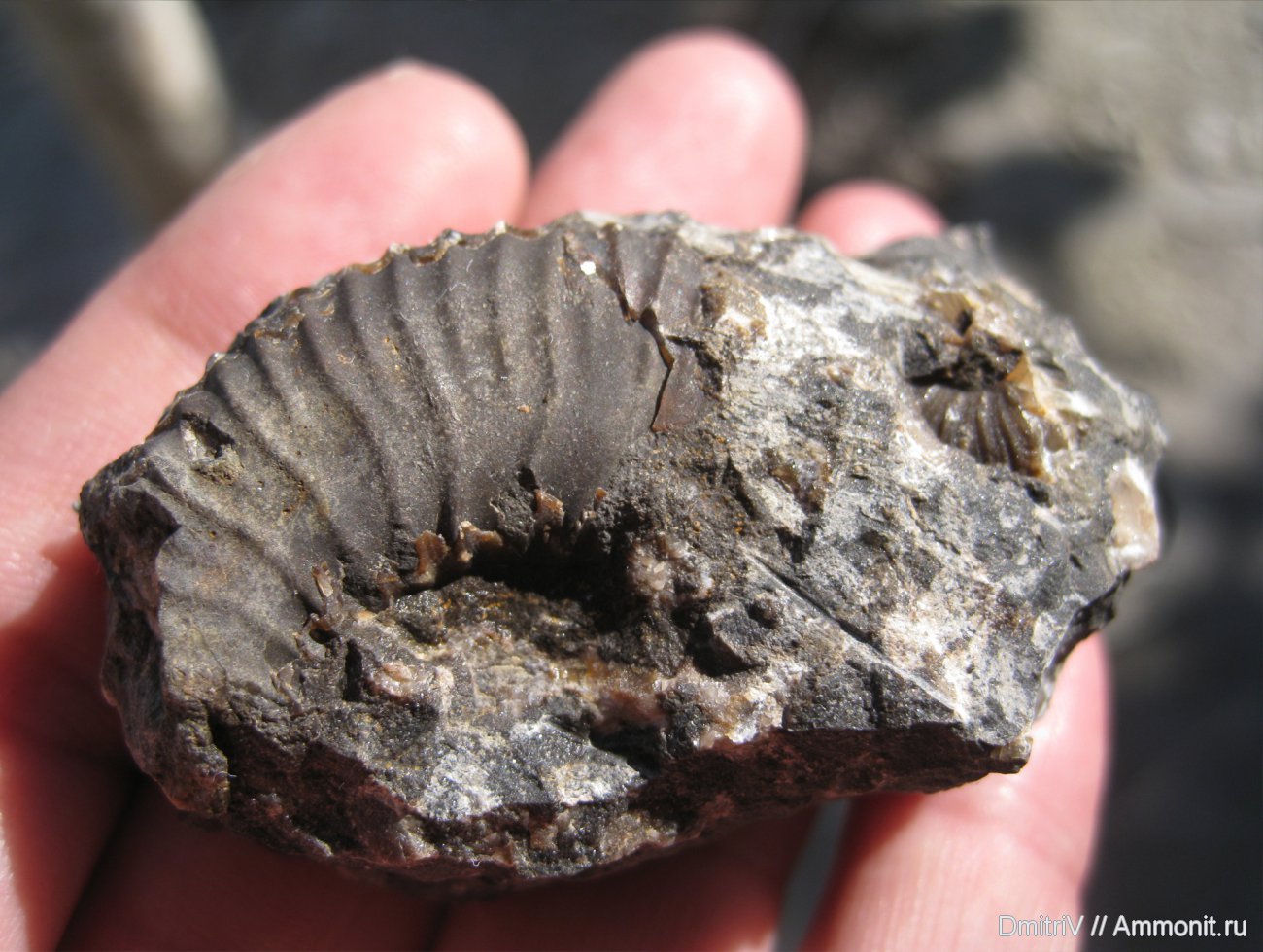 На этом фото видно только два фрагмента аммонитов (всего на этом куске породы три). Дальше очищать не стали.