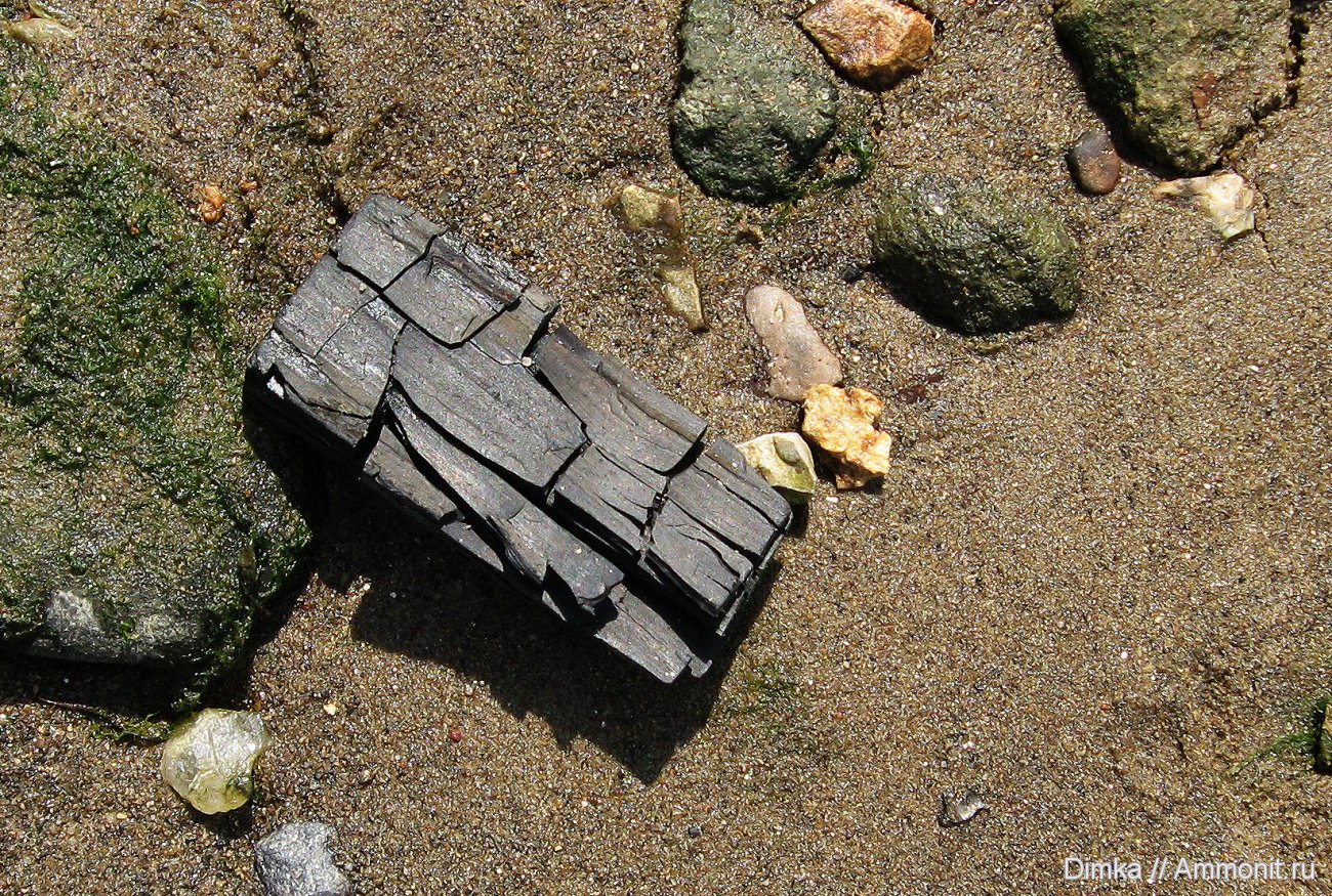 Кусок окаменелой, больше похожей на обуглившуюся древесины, найденной в юрских отложениях на берегу р. Волги у г. Рыбинск. Размер фрагмента около 8 см.