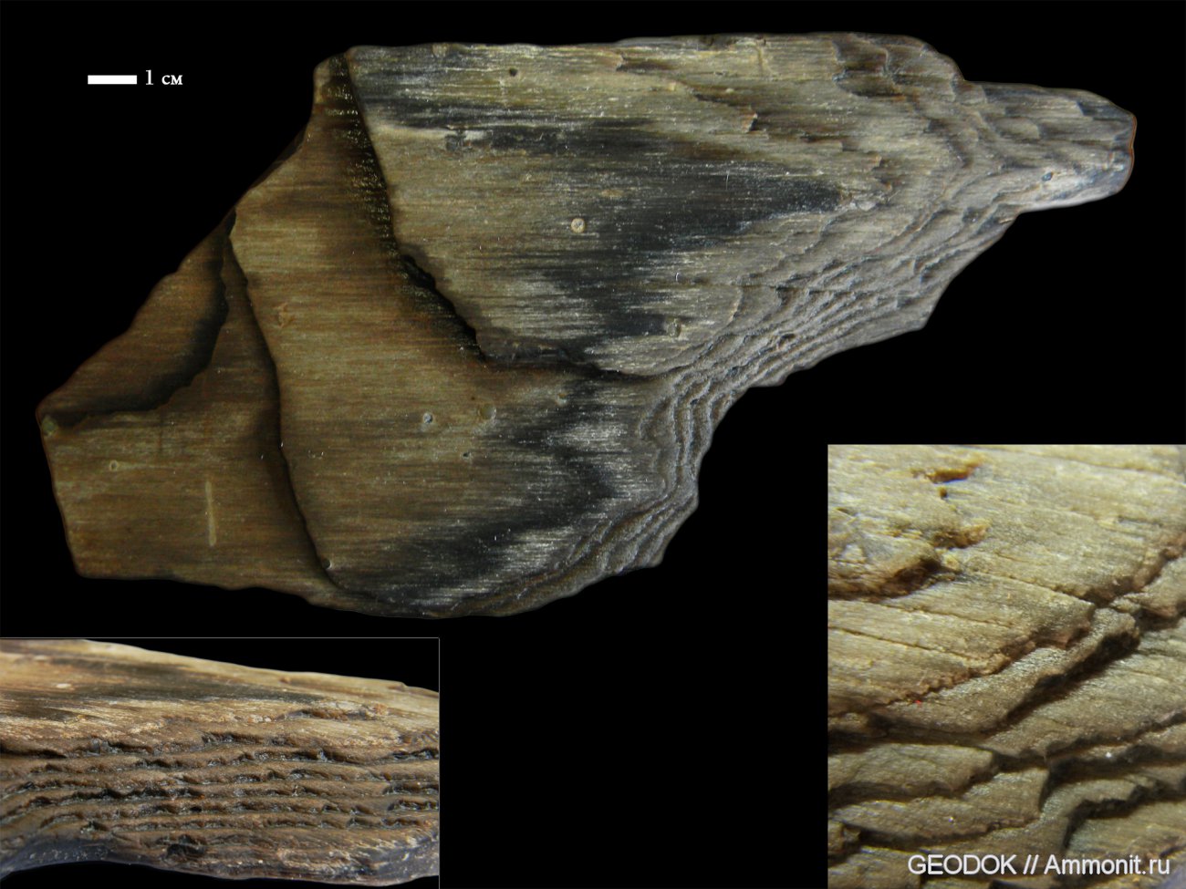 Иногда встречаются фрагменты древесины и отметинами древоточцев. Была лет пятнадцать назад одним человеком сделана находка сарматской древесины с фоссилизированной личинкой внутри дерева. Вся древесина в Горячем Ключе, независимо от возраста, приурочена к глинам. На деревяшке представленной на этой фотографии есть какие-то небольшие правильной круглой формы отверстия, заполненные минералом, их там не меньше десятка, что это за отверстия не понятно. | ||||||