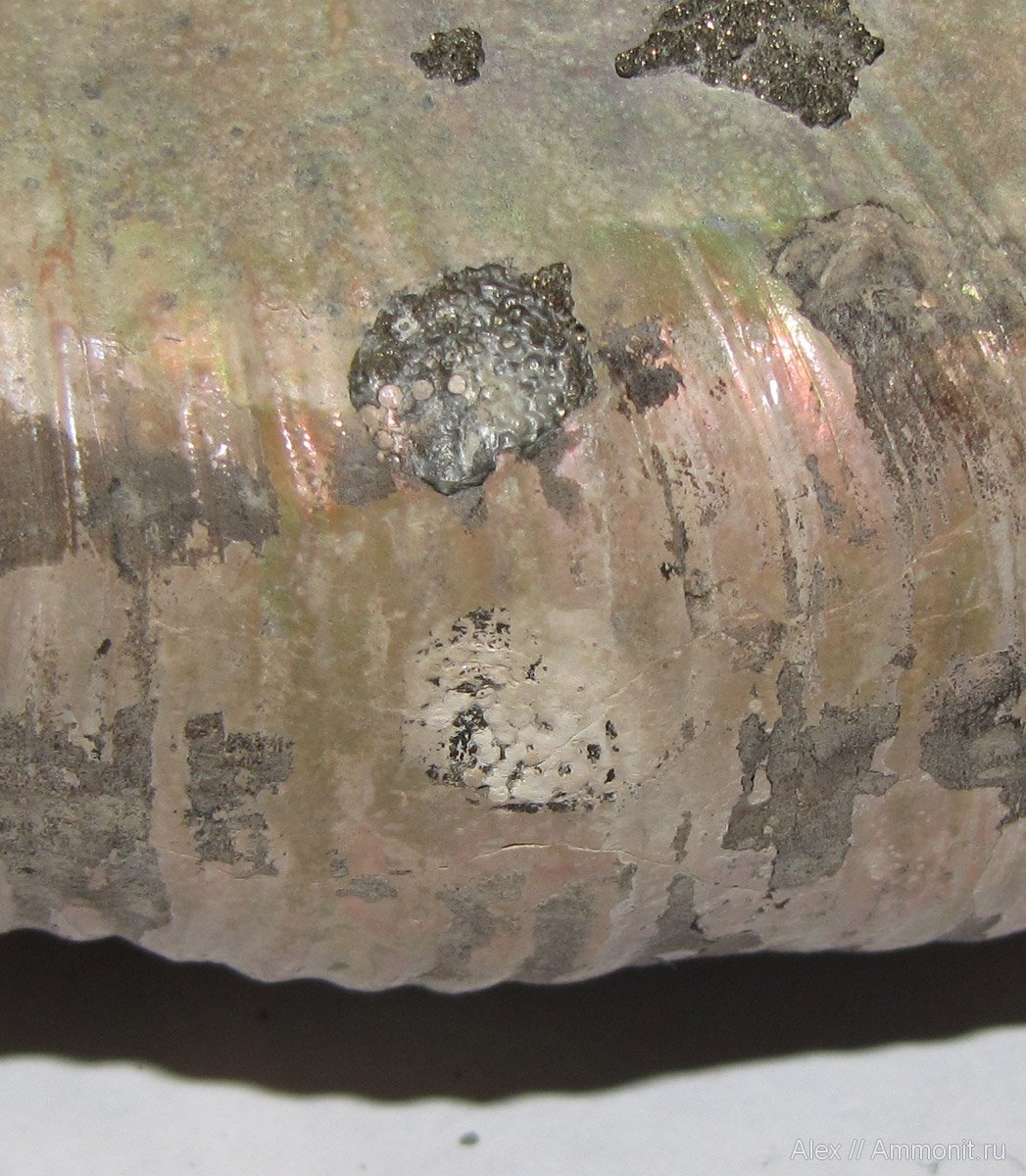 Видимо, кто-то использовал раковину аммонита, судя по всему вполне живого, для прикрепления своих кладок яиц. Диаметр каждой кладки 7-8 мм.
