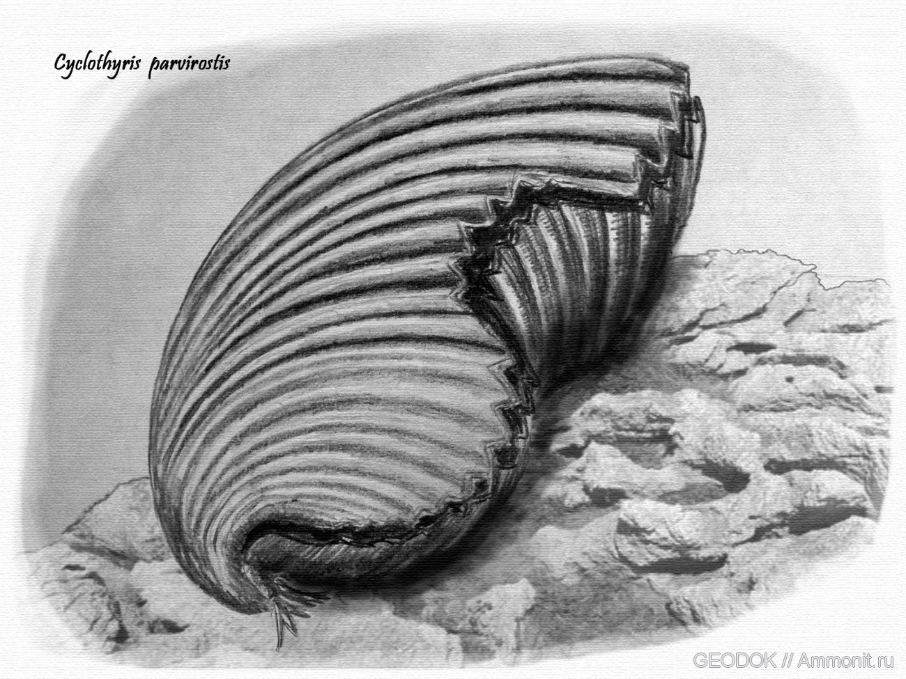 В книгах, определителях и т. д. мы привыкли видеть брахиопод ориентированных макушкой вверх. Так уж повелось. Но часто их естественное прижизненное положение макушкой вниз, поэтому мне стало интересно, представить эту картину на бумаге. На рисунке реконструкция Cyclothiris parvirostis из позднего апта Горячего Ключа.