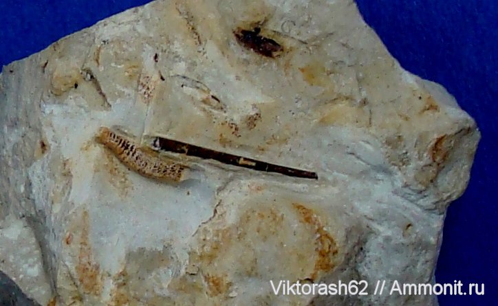 Расчищая край длинного моллюска, под ним обнаружился другой моллюск, другого вида. Размер длинного моллюска 21 мм. Найдены в р.Днестр в мергелях верхнего мела .